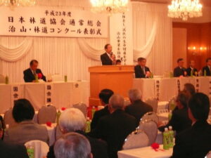 「平成23年度治山・林道工事コンクール表彰式」がホテルルポール麹町(東京)において11月15日午後、日本林道協会の通常総会の後行われました。
